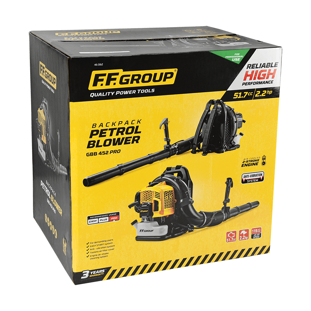 Φυσητήρας πλάτης βενζίνης GBB 452 PRO FF Group 46062. Περιλαμβάνεται σκανδάλη γκαζιού με λαβή ελέγχου, εξάρτηση πλάτης, δοχείο μίξης καυσίμου, μπουζόκλειδο, σφιγκτήρας: x2, γερμανικό κλειδί, κλειδί άλλεν, ίσιο κατσαβίδι.
