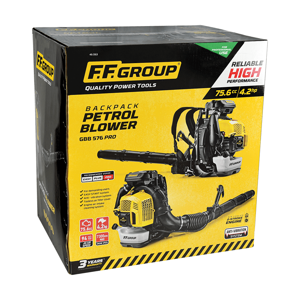 Φυσητήρας πλάτης βενζίνης GBB 576 PRO FF Group 46063. Περιλαμβάνεται σκανδάλη γκαζιού με λαβή ελέγχου, εξάρτηση πλάτης, δοχείο μίξης καυσίμου, μπουζόκλειδο, σφιγκτήρας: x2, γερμανικό κλειδί, κλειδί άλλεν, ίσιο κατσαβίδι.