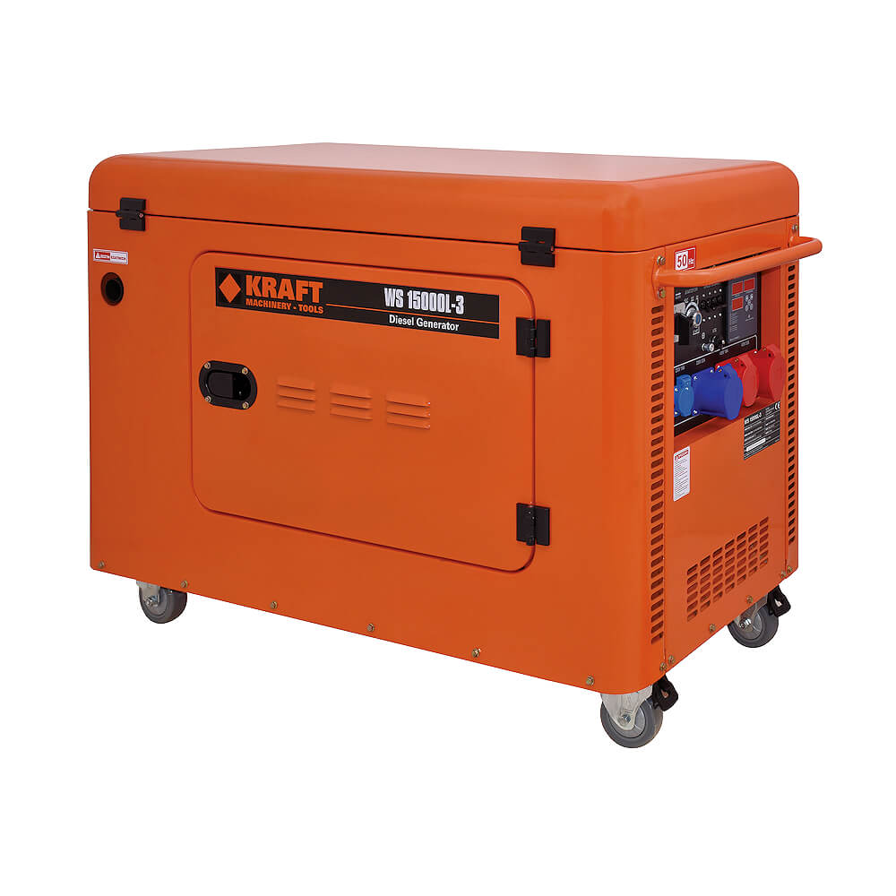 Ηλεκτρογεννήτρια πετρελαίου Kraft WS 15000L-3. Τριφασική κλειστού τύπου, με μίζα, μπαταρία, αυτόματο μεταγωγικό πίνακα, σταθεροποιητή τάσης και με ηλεκτρονικό πίνακα πολλαπλής προστασίας. Σε τροχήλατο πλαίσιο.