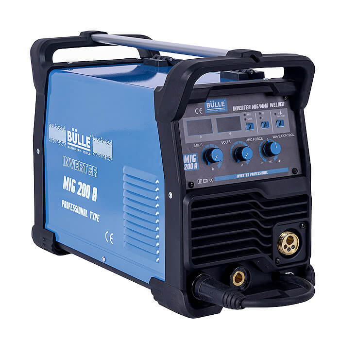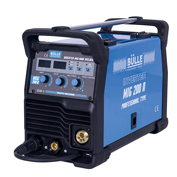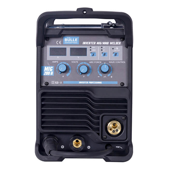 Ηλεκτροσυγκόλληση Bülle MIG 200A. Συνοδεύεται με: τσιμπίδα MIG 3 m, τσιμπίδα ηλεκτροδίου 3 m, σώμα γείωσης με καλώδιο 3 m. Επαγγελματική inverter ηλεκτροσυγκόλληση MIG & MMA. Με ψηφιακή οθόνη, δυνατότητα ρύθμισης 2T/4T, Arc force και Wave control. Δυνατότητα χρήσης με ή χωρίς αέριο (gas - no gas). Στιβαρή κατασκευή, σύγχρονος σχεδιασμός. Αποδόσεις σύμφωνα με τα Ευρωπαϊκά πρότυπα LVD: ΕΝ 60974-1 & EMC: ΕΝ 60974-10.