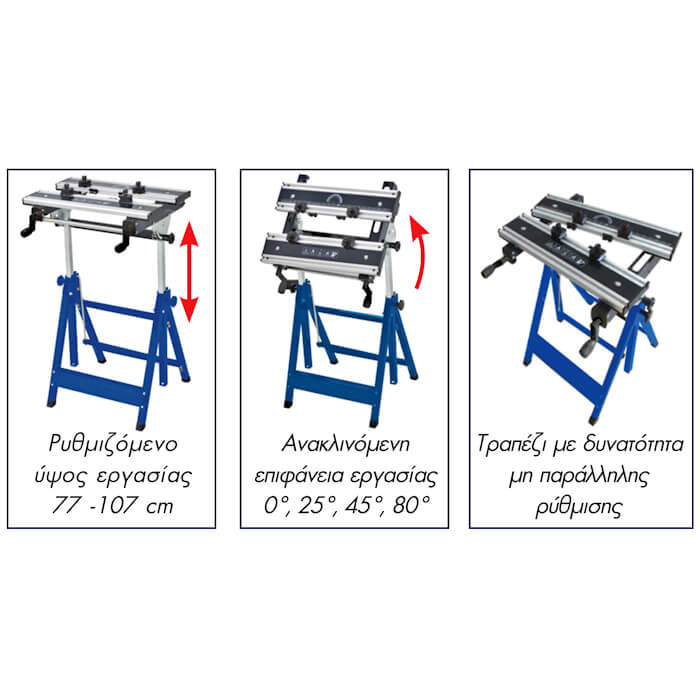 Πάγκος εργασίας με αλουμινένιο ανακλινόμενο τραπέζι Bülle 47611. 7 ρυθμιζόμενες θέσεις ύψους. 4 ρυθμιζόμενες γωνίες κλίσης τραπεζιού 0° έως 80°.