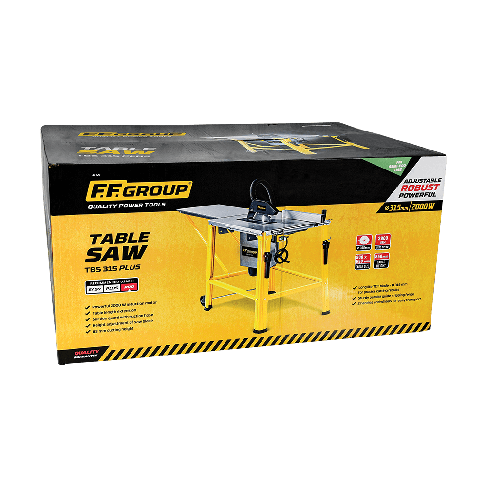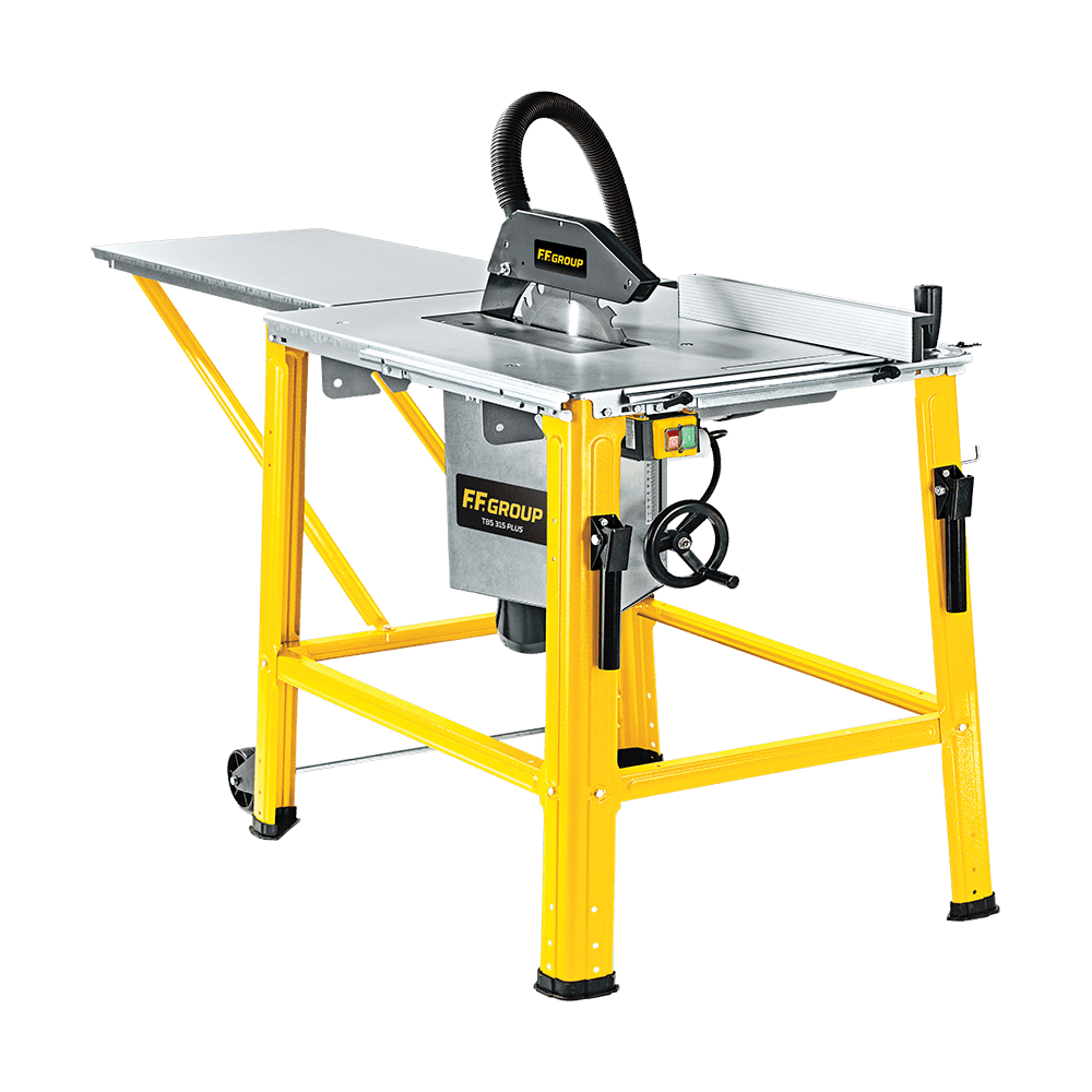 Παγκοπρίονο TBS 315 PLUS FF Group 45527. Περιλαμβάνεται 2 x λαβή προώθησης, ρυθμιστής ύψους του πάγκου, oδηγός παράλληλης κοπής, απορροφητής σκόνης, προστατευτικό αναρρόφησης.