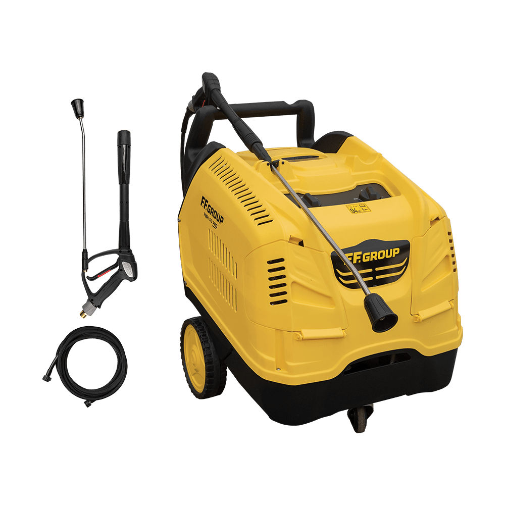 Πλυστικό μηχάνημα ζεστού νερού PWH 170 PRO FF Group 46426. Περιλαμβάνονται μεταλλική κάνη, μεταλλικό πιστόλι, μπεκ υψηλής πίεσης (15°), ενισχυμένος σωλήνας υψηλής πίεσης 10 m.