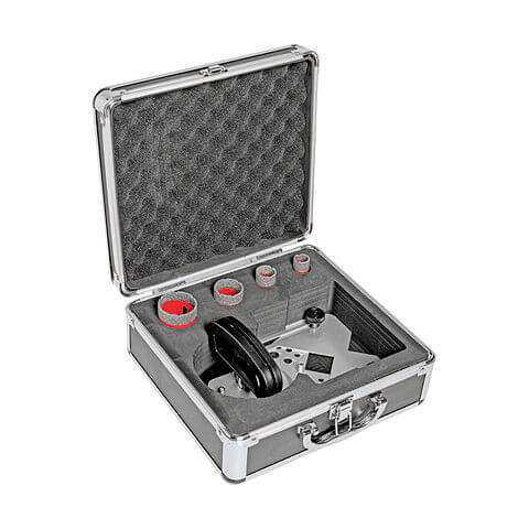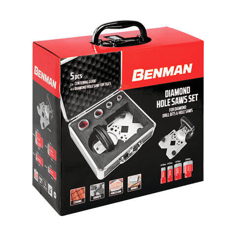 Διαμαντοκορώνες πλακιδίων ξηρής διάτρησης Benman σετ 5 τεμαχίων, ιδανικές για καθαρές και υψηλής ακρίβειας οπές σε κεραμικά, πλακάκια, γρανίτη και μάρμαρο. Είναι κατάλληλες για χρήση με γωνιακό τροχό (σπείρωμα Μ14) και είναι ιδανικές για ηλεκτρολόγους, υδραυλικούς και πλακάδες. Η συσκευασία περιλαμβάνει 4 διαμαντοκορώνες (20, 25, 35 και 45 mm) και 1 οδηγό κεντραρίσματος. Το βάθος διάτρησης είναι από 35 mm έως 40 mm.