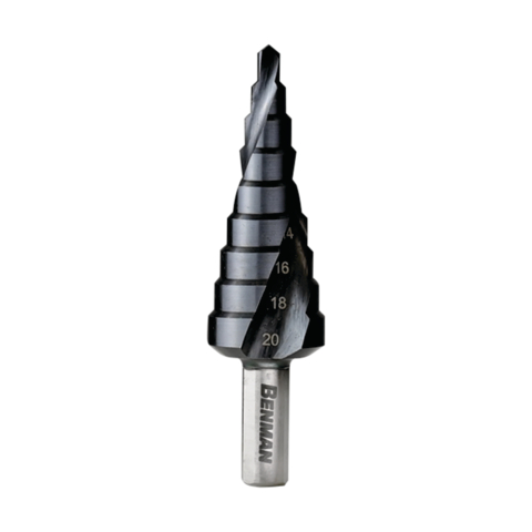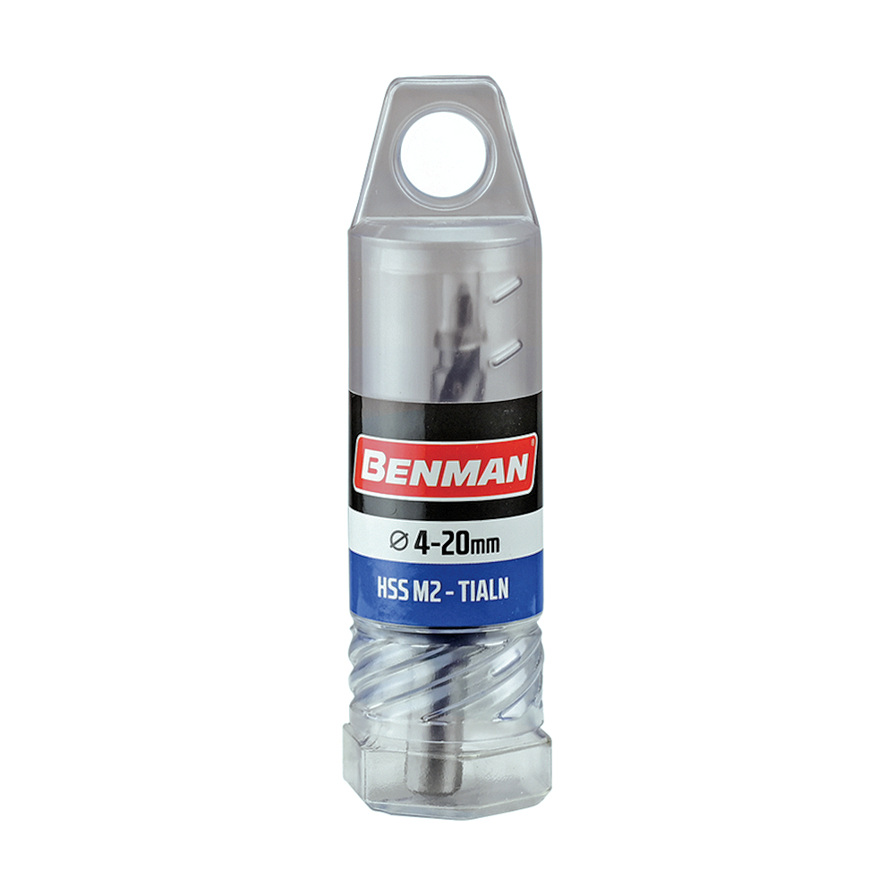 Τρυπάνια Benman HSS M2 κλιμακωτά μετρικά σπιράλ για άνοιγμα μεγάλων οπών σε διάφορες διαμέτρους. Η σπειρωειδής ελίκωση απομακρύνει εύκολα τα γρέζια. Από ταχυχάλυβα (HSS) με ειδική επίστρωση TiAIN (νιτρίδιο τιτανίου αλουμινίου) για μεγάλη διάρκεια ζωής.