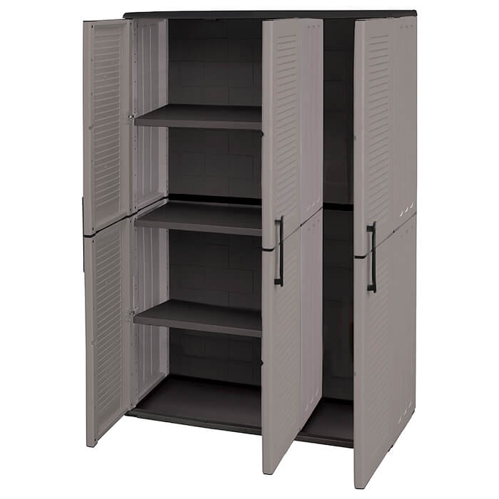 Πλαστική ντουλάπα Unimac Easy E101, με ράφια και χώρο για σκούπα και 3 πόρτες. Διαστάσεις: 102 x 37 x 163 cm.